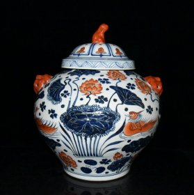 瓷器 元代幕府金莲川矾红青花鸳鸯戏水纹盖罐【37.532cm】