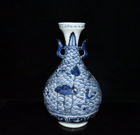 旧藏 元代博陵第青花雕刻鸳鸯戏水纹双耳瓶【 35x22cm 】