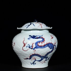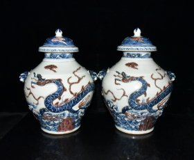 旧藏 元代青花釉里红堆雕海水龙纹盖罐一对【34×26cm】