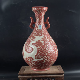 元红釉海水龙纹双耳瓶