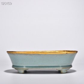 宋汝窑天青釉水仙盆鎏金錾刻镶嵌宝石3(乾隆御题铭文) ,