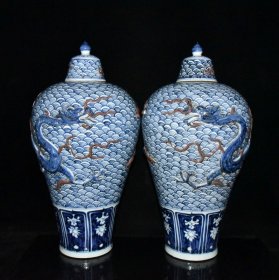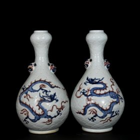 旧藏 元代博陵第青花釉里红浮雕海水龙纹梅瓶一对【50x25cm】