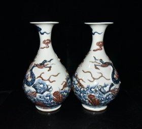 旧藏 元代青花釉里红堆雕海水龙纹玉壶春瓶一对【35×21cm】