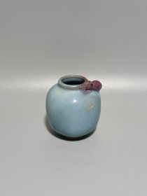 宋代钧窑天蓝釉水盂罐,尺寸直径6cm高6.8cm,釉色均匀自然,天蓝色泽温润,局部有紫红色窑变斑纹。品相完好,适合收藏摆件。