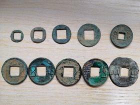 秦汉时期 铜钱 钱币10枚 不同版别 大小尺寸不一,10个版别, 黄铜绿锈 大全五十 五珠大方孔 五珠 货泉 大尺寸八株半两 水银五珠 官母钱等,如此多版别少见,原汁原味 收藏研究不错的标本 详细如图所示,编号3
