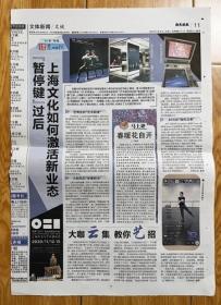 上海国际舞蹈中心舞剧朱鹮 上海话剧艺术中心话剧热干面之味 上海交响乐团音乐总监余隆 上海大剧院总经理张笑丁 昆曲演员张军 上汽上海文化广场总经理张洁报纸报道1页 彩页 2020年6月14日