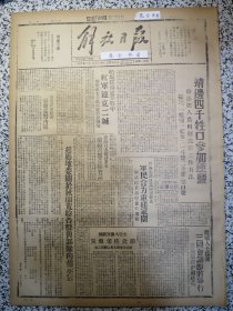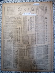 解放日报1946年社论:再接再励争取全面抵抗的胜利,鲁南我军收复兰陵蒋军两团溃回峰县,晋冀鲁豫军区发表公报鄄城之役歼敌六千,东北政委会批准呼伦贝尔区蒙民自治,范代厅长在边府委员会上报告整顿财政支援自卫战争,嫩江四十万农民获地四百万亩,参议会礼堂昨举行晚会欢迎陈瑾昆董策丞两先生,刘延玉全家团圆,拥政爱民的模范朱把头,班长张林—九旅突围英雄之二,钱来苏关于杜甫, 1954年官方影印,4版裁开,4开全