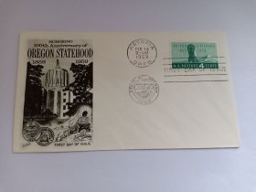 美国首日封 1959年俄勒冈州成立100周年纪念首日封 州议会大厦 俄勒冈州塞勒姆 移民的大篷车 贴美国邮票4c俄勒冈州加入联邦一百周年(1859—1959年)篷车和高山