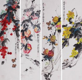 周金阊作品 张大千第三代 可合影 【大千画派第三代传人】 ——当代著名画家周金阊先生创作精品 《事事如意》 尺寸:100cmX25cm X4幅十平尺 附带收藏证书 作者合影 画集 合影视频