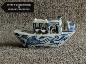 明中期 青花凤纹船形文房砚滴。高8厘米、长15厘米、宽5厘米 ,以瓷为舟,绘就青花凤纹,灵动飘逸。精巧的船身设计,既具实用之美,又含艺术之韵,宛如一件流动的文化瑰宝,静静诉说着往昔文人案头的风雅时光。