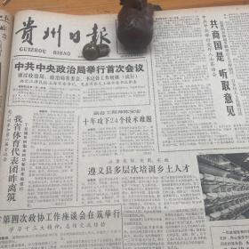 我省侯丹梅获最佳表演奖!杨嘉陵获优秀表演奖!第二版,独山县的调查,正安三百娘子军出师广东纪实。我省伤残运动员周贵兴。第三版,蹇先艾文章。胡维汉、蹇先艾、邢立斌、董克俊、杨长槐、叶辛、石果、戴明贤、罗星芳等照片。我国学位授予工作取得很大成绩。我国土地使用制度开始进行改革。《贵州日报》