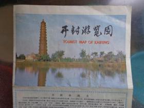 开封游览图 1985年 4开独版 开封市区游览图, 开封市郊公共汽车路线图,相国寺、汴京公园、龙亭公园、铁塔公园、禹王台和繁塔、黄河游览区导览图。开封市区公交线路一览表。