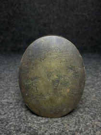 白铜墨盒 白铜又称为银白铜,常用作墨盒面和四边的材料。收藏爱好者十分钟爱白铜墨盒,因为白铜墨盒耐空气腐蚀,韵味十足,质地较为细腻,有易于篆刻等优点。 尺寸,长宽厚10.5/8/4厘米,重297克