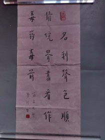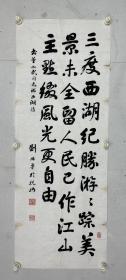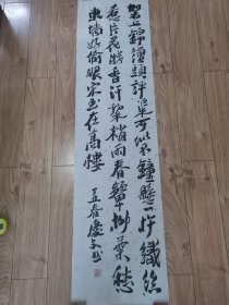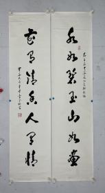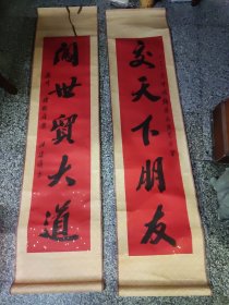 汪廷汉(红对联)1幅,119*28厘米**2,未盖 章,已装裱,,汪廷汉 温州市著名书法家,师从蔡心谷、高天受等先生。工书法,初学李北海,上溯六朝两汉碑刻;善篆刻,依秦汉遗制而入浙皖两派。