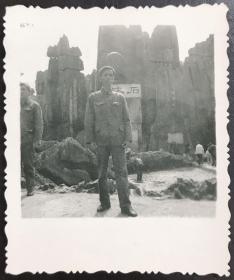 男单身照片第75-《光艺摄影社拍摄(穿军装帅气青年战士坐车留影)》4-5寸黑白原版衬底开窗老照片、老相片、老像片、老资料约1960-1970年代左右(昆明金碧路12号)1张