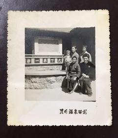 一般合影照227-《海燕摄影社拍摄(短发帅气穿军装青年战士和弟妹们共6人合影留念)》4-5寸黑白原版有衬底开窗老照片、老相片、老像片、老资料约1960-1970年代左右(昆明南屏街)1张