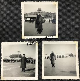 【系列照片】一女青年于北京著名景点留影及周边景象3张合售,含天安门、景山、颐和园十七孔桥(昆明湖结冰)。该女子身穿军大衣,人物形象朝气蓬勃、落落大方,取景端正。老照片影像清晰,颇为难得