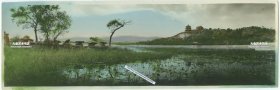 民国北京颐和园东岸知春亭附近拍摄水草风貌的昆明湖,右侧可见万寿山佛香阁,宽幅上色全景老照片一张。专业摄影师拍摄,上色构图意境均属一流。25X7.9厘米。