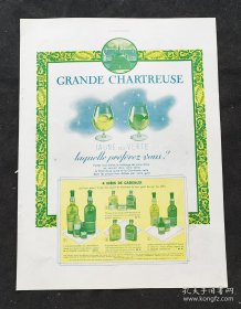 图一为查特酒广告,它是法国历史悠久的草本利口酒,由卡尔特会修士于17世纪创制,以黄绿两款经典酒液闻名,是法国酒类文化的代表之一。图二左为一体式弹性背带广告,强调“如此轻盈……如此柔软”的特性,且在多国获得专利,右为法国香城普罗旺斯的慕莲勒品牌香水广告,详看说明,1938年12月10日刊 原版法国画刊广告单页