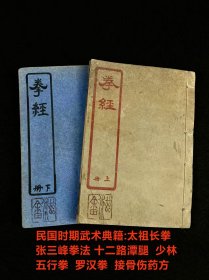 民国时期武术典籍【拳经】全套上下两册,线装古籍,内容包括:宋太祖长拳、内家 张三峰拳法、十二路潭腿、少林五行拳、罗汉拳、接骨伤药方等,适合收藏或研究武术历史的朋友!