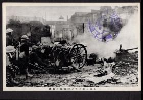 [SXA-S09-05]英日文明信片(无资/早期摄影片)/日本1931年进攻上海时日军陆战队炮击市区场景/加盖(昭和)7年5月25日(1932.05.25)拜观纪念章戳,14X9厘米。