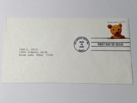 美国首日封 2002年泰迪熊诞生百年纪念首日封 贴美国邮票37c 2002年庆祝泰迪熊100周年 泰迪熊玩具 毛绒玩具 儿童玩具 Teddy Bear译为泰迪熊,美国当地称罗斯福熊,是儿童玩耍的填充玩具熊,是一种历史悠久的毛绒玩具,常常被用来安慰孩子们的难过情绪。近年来一些泰迪熊变成了昂贵的收藏品。泰迪熊以美国总统西奥多·罗斯福命名,因为罗斯福的小名就是泰迪,他喜欢狩猎,曾拯救一头小熊
