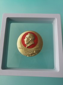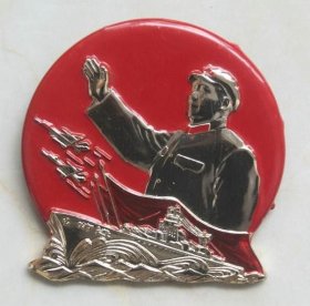 毛主席像章 (正面图:毛主席头像 金黄色细网格形光芒线 飞机 军舰 浪花;背文:毛主席万岁)[规格尺寸:4*4cm]【一枚很漂亮的金黄色像章 收藏佳品;实物拍照 品质自鉴】