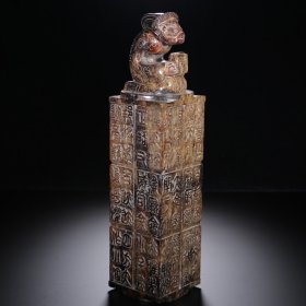 明成化二年客竹斋作徐有贞记印章1枚,鸟虫篆文,印章上端雕有一只神兽钮。印材整体温润,边角有缺损,横约3.5cm,高约6.5cm。文房雅玩。徐有贞,明代大臣,学者,江苏吴县人。