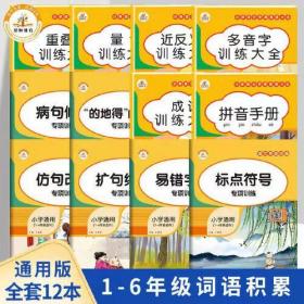 全套12本缺一本,共存11本,1病句修改专项训练2成语训练大全3“的地得”的用法4量词训练大全5拼音手册训练大全6仿句改句专项训练7重叠词训练大全8近反义词训练大全9多音字训练大全10标点符号专项训练11扩句缩句专项训练小学通用,1—6年级适用