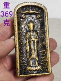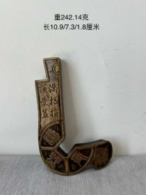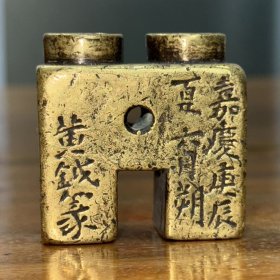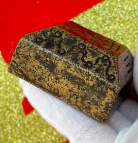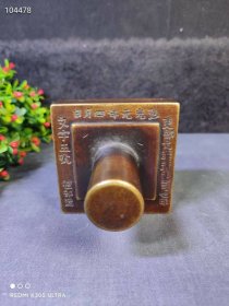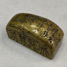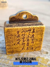 器型简单的一枚黄铜印章 四面都有字 皮壳黄亮, 长度5.1宽2.5高2.8 重230克