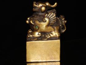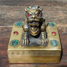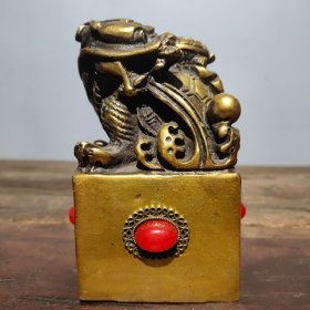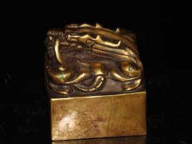 珍藏老铜印 老黄铜镶嵌宝石【古龙神兽】玉玺铜印章书房闲章摆件 高10厘米长9厘米宽9厘米,重1740克,