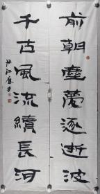 王-辉夫妇旧藏:黑龙江书画家、原牡丹江师范学院教授 张应力 书法对联《前朝尘梦逐逝波,千古风流续长河》一幅(纸本软片,约4.2平尺*2,钤印:张、应力)HXT400187