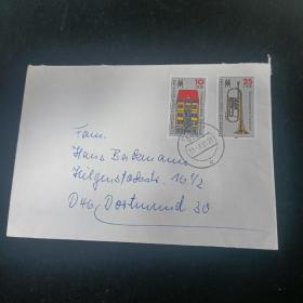 F2812外国实寄封 贴德国邮票东德1985年莱比锡秋季博览会建筑乐器小号2全 如图
