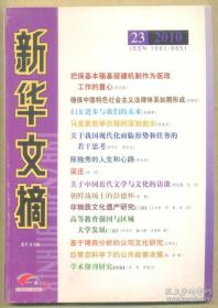 新华文摘 2010年第23期 为张居正正名/关于中国近代文学与文化的访谈/从过程思维看马克思主义文论范畴的当代扩展/马克思主义文学批评的困境与出路/朝鲜战场上的彭德怀/马克思哲学历程的深刻启示/人文学科与社会科学的统一性/生态文明的人学思考/元代文艺复古思潮与传统印章的新变/基于博弈分析的公司文化研究/手机媒体的现状与未来/中国量刑程序改革:误区与正道