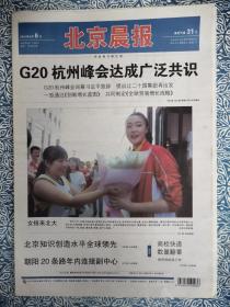 《北京晨报》2016年9月6日,今日四开十四版,(已经停刊)G20杭州峰会达成广泛共识,女排来北大,火锅车展,郎朗音乐情书致纽约,“金刚”恩怨何时了,日元之覆人民币足鉴,京承皇家御道对接草原天路。