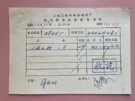 电影资料名人签名,(北京电影制片厂科教片组——上海科学教育电影制片厂——上海工农兵电影制片厂——上海东方明珠实业发展有限公司),1973年,印染法试验组看片,《上海新貌》,签名 张耀明 傅玉成,徐臻泉(上海市人。中国电影家协会会员。1964年起从事科学教育电影制片工作,上海科学教育电影制片厂经营办主任。参加过《红绿灯下》《儿童防聋》等二十余部科教片的制片)