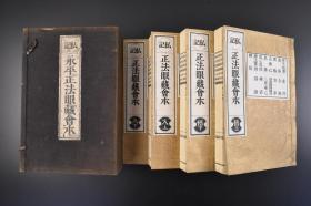 (丁0953)私记《永平正法眼藏会本》和本 原封线装4册全 秀英舍 鸿盟社 1896年 正法眼藏,禅宗用来指全体佛法(正法)。朗照宇宙谓眼,包含万有谓藏。相传释迦牟尼佛在灵山法会以正法眼藏付与大弟子迦叶,是为禅宗初祖,为佛教以“心传心”授法的开始。日文版