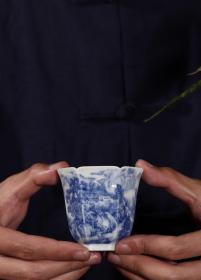 朗古雅藏/重工手绘青花山水内外绘六方主人杯器型棱角分明,端正精致。绘画工笔细腻老道。画面布局层次分明,远山近水,乡里人家,意境十足。高6.7cm宽6.3cm容量80ml