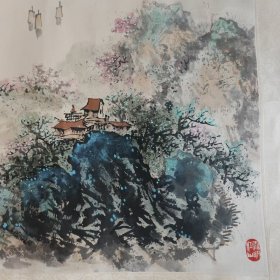 江南山水画作品,品相完好。画面构图精美,远山近水层次分明,蓝色渲染清新淡雅。画中有亭台楼阁、飞鸟、梅花等元素,意境优美。 尺寸约68x68厘米,采用宣纸材质,属于写意山水画。适合客厅书房悬挂装饰。