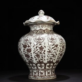 明洪武釉里红花卉纹瓜楞荷叶罐54*34厘米