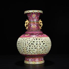 清乾隆轧道胭脂红花卉镂空转心瓶