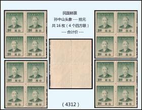 民国邮票《孙中山头象---拾元》共16枚(4个四方联)合计价:(4312)