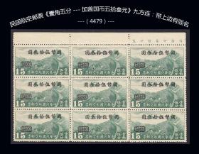 民国航空邮票《壹角五分---加盖国币五拾叁元》九方连:带上边有版名。谢绝还价(4479)