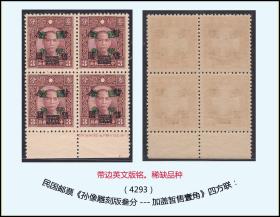 民国邮票《孙像雕刻版叁分---加盖暂售壹角》四方联:带边英文版铭。稀缺品种。(4293)