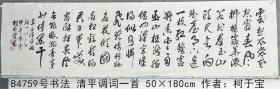 B4759号书法 李白 清平调 50×180cm 柯于宝 湖北阳新人生于1952年元月,系湖北航天有限公司退体职工 作品多次入选黄石市四区二县大型书画展 现为中国老年书画学会理事 湖北省老年书画家研究会会员 云想衣裳花想容,春风拂槛露华浓。若非群玉山头见,会向瑶台月下逢。一枝秾艳露凝香,云雨巫山枉断肠。借问汉宫谁得似,可怜飞燕倚新妆。名花倾国两相欢,长得君王带笑看。解释春风无限恨,沉香亭北倚阑干。