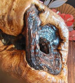 Bt5 、【同心环蚕丝纹】,【柔韧的新生蚕丝外皮紧密包裹着两个同心环形沧桑古木构造】,【特别神奇精美的天然蚕丝纹笔筒】。兴安岭原始森林有一颗古柞树,它的一个树枝受病枯萎了。这颗古柞树以特别惊人的自我修复力,围绕着枯萎的同心环古木长出了蚕丝纹曲线组织。经过几十年的功夫,把枯萎的同心环古木紧紧地包裹起来了!出现了一个生命力极强的精美的蚕丝纹树筒。尺度:18*14*12.8㎝。重量:810克。