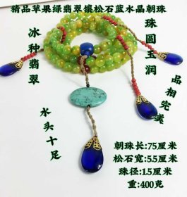 400_天然苹果绿翡翠镶松石蓝水晶朝珠项链,冰种翡翠,珠圆玉润,