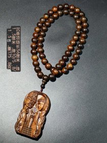 沉香项链,图案:正面雕刻一尊宁静的佛像,右侧为怒目护法神(如金刚力士或夜叉),象征慈悲与威严的平衡。背景饰有佛塔、法轮和阶梯,代表佛教中的智慧、法教与修行阶梯。