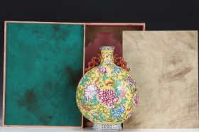 H33---旧藏清乾隆时期珐琅彩双耳抱月瓶高36厘米口经6.5厘米肚经28厘米整体品相完好无瑕疵。此瓶采用精美的珐琅彩工艺色彩鲜艳图案为花卉和桃子象征长寿和繁荣。