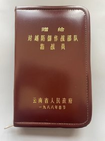 老物件 1988年云南省人民政府赠给对越防御作战指战员洗漱包 皮质外包装,内含刀叉、勺子、镜子、肥皂、牙膏等,拉链正常,印刷字体清晰 包内用具不全,实物拍摄,品相自鉴纪念章,奖章,徽章,品相大小如图